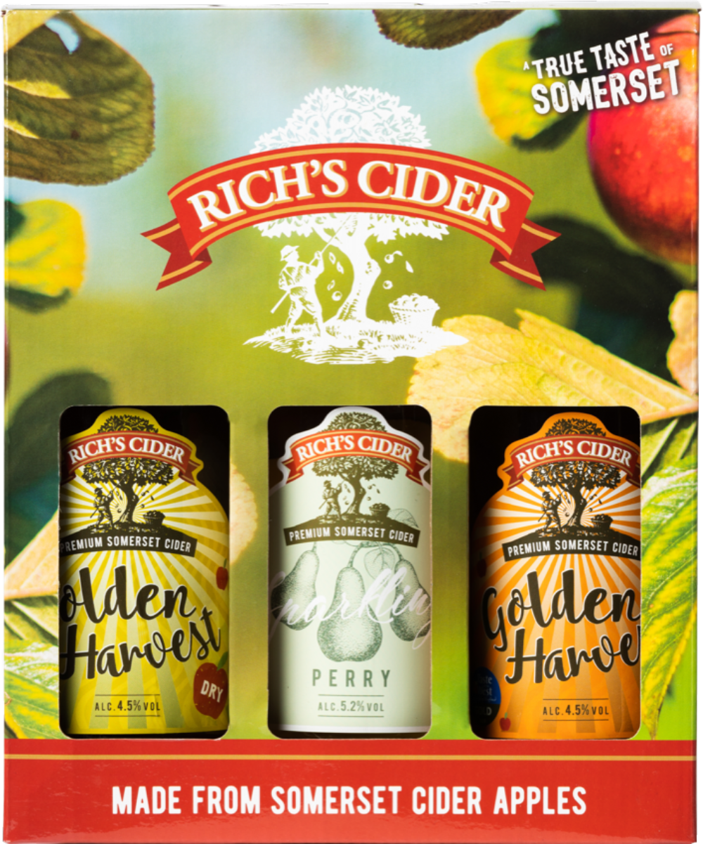 A gift pack containing Golden Harvest Cider Dry, Golden Harvest Cider Medium, and Sparkling Perry.