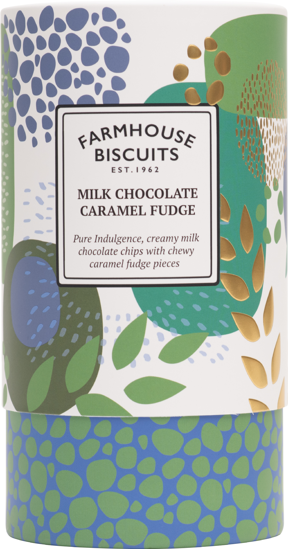 Pure Indulgence, creamy milk chocolate chips with chewy caramel fudge pieces. They are wrapped in a luxury textured abstract design tube. A chocolate lovers delight.