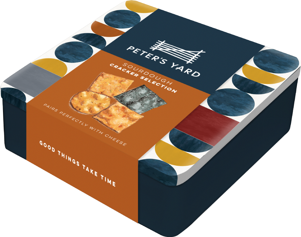 A selection tin of four crackers to pair perfectly with cheese. Contains Original Sourdough Crackers, Rye & Charcoal Sourdough Crackers, Pumpkin & Sunflower Seed Sourdough Crackers, Rosemary & Sea Salt Sourdough Crackers.