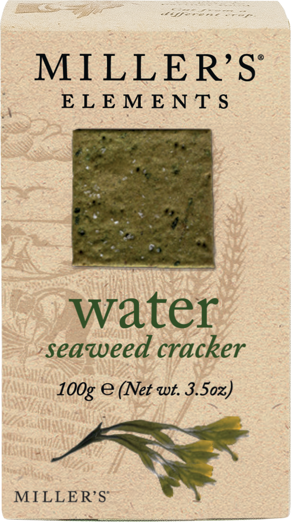 Made with seaweed. Now, Miller's Water makes a cool contrast in a different way, as it is a new seaweed recipe. Flame-baked in a flash, for a toasty finish.