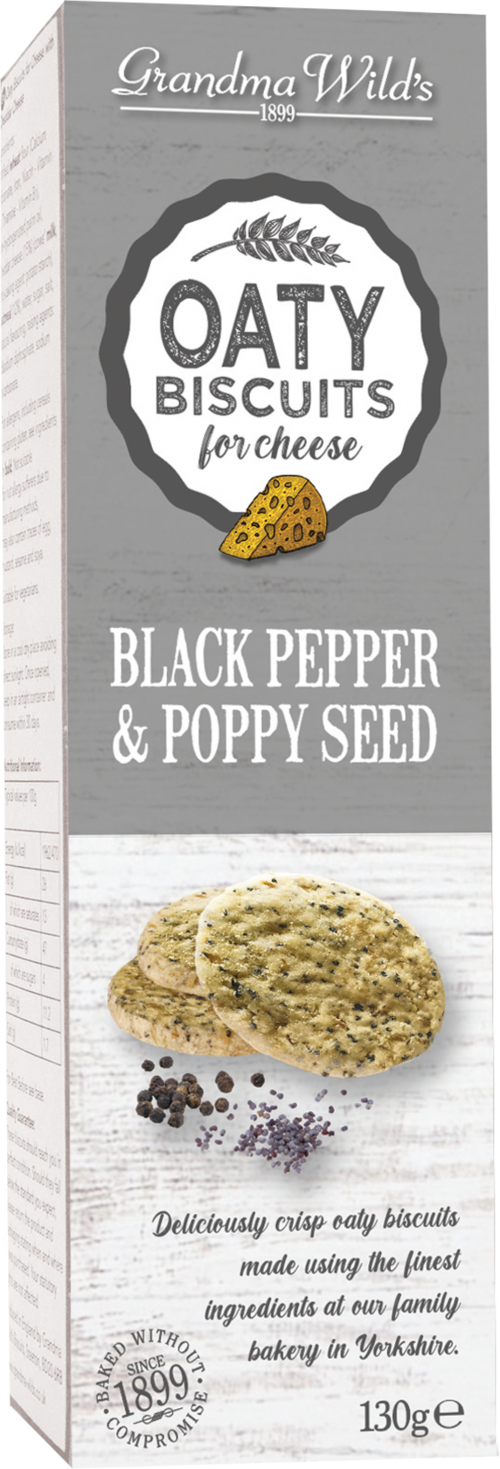 Fortified wheat flour (Calcium Carbonate, Iron, Niacin –Vitamin B 3 , Thiamine-Vitamin B 1 ), non-hydrogenated palm oil, oatmeal (13%), water, poppy seeds (7%), sugar, salt, black pepper, raising agents: disodium diphosphate, sodium bicarbonate.
