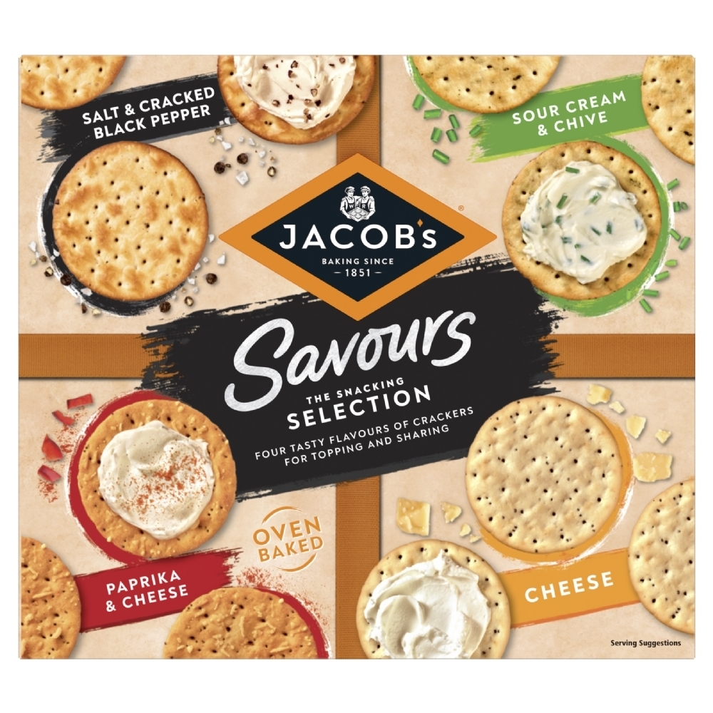 Jacob's Savours, baked wheat crackers flavoured with delicious ingredients for a tasty snack. Jacob's is the number one savoury biscuit brand and has been baking its delicious savoury snacks, packed with flavour and crunch, since 1851. Contains: