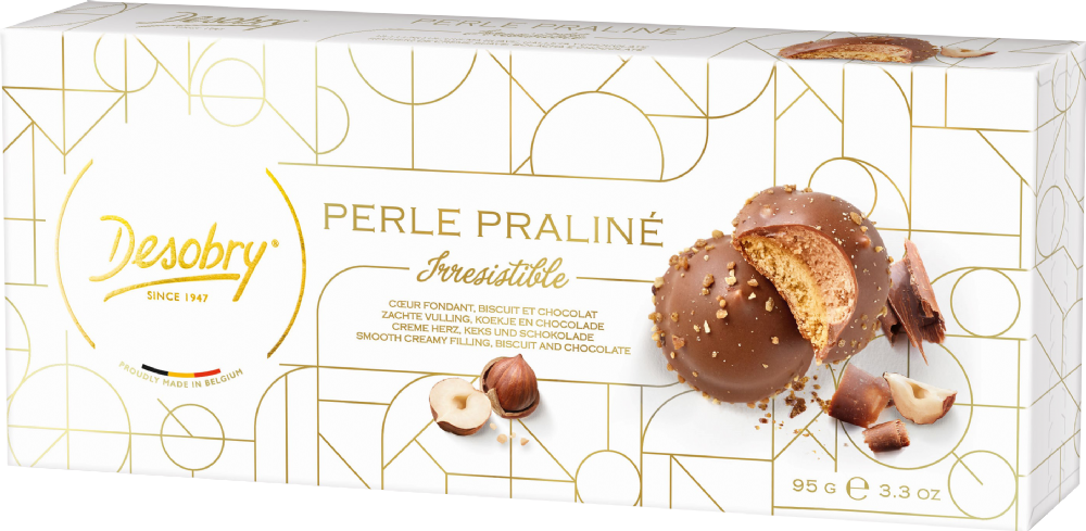 A smooth Gianduja praline cream on a thin crispy biscuit, enrobed in milk chocolate and decorated with caramelized hazelnuts.