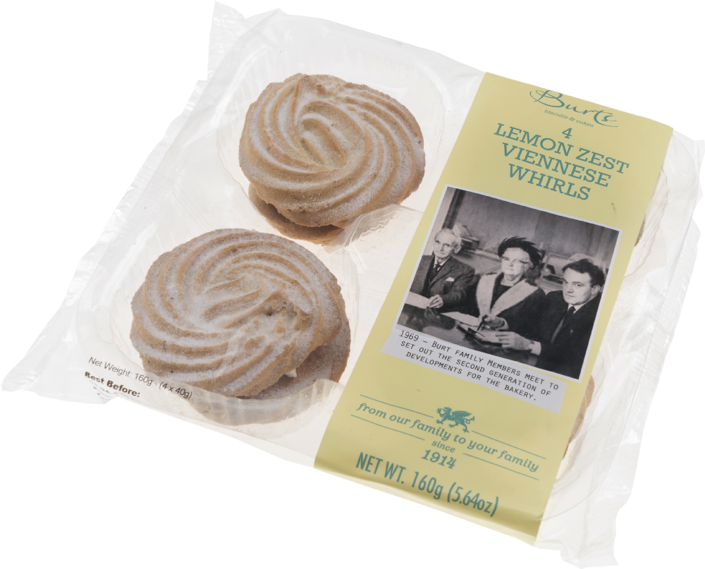Four individual Lemon Zest Viennese biscuit whirls sandwiched together with lemon curd and buttercream.