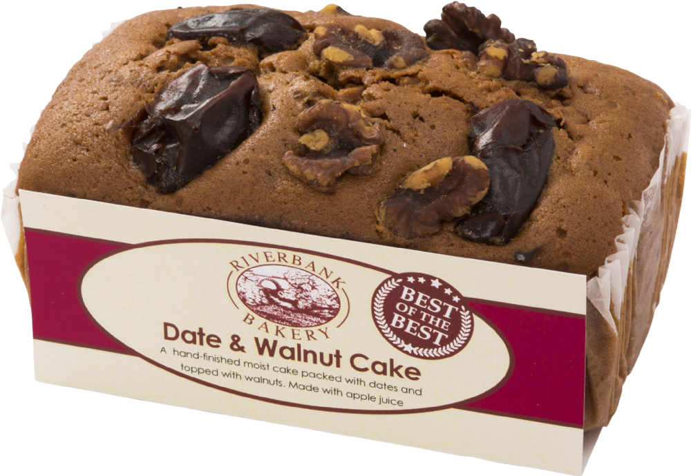 Our date and walnut cake is a hand-finished, moist fruit cake made with chopped dates and decorated with walnuts and whole dates.