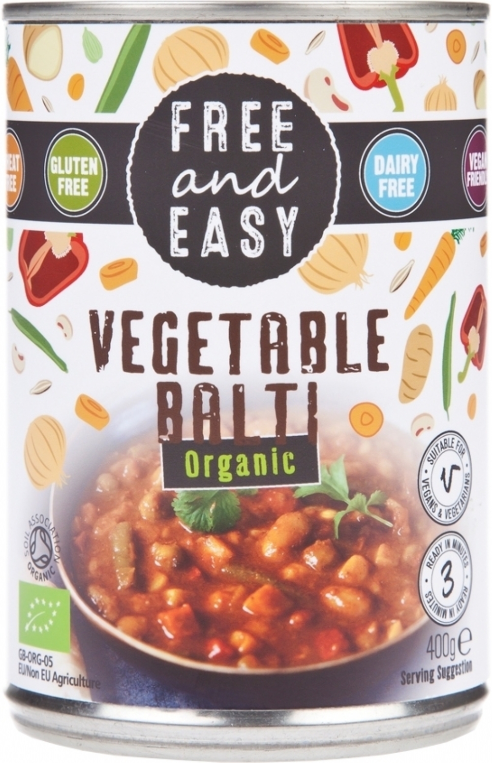 Water, Vegetables (29%) (Potato*, Carrots*, Red Peppers*, Peas*, Onion*, Green beans*), Cannellini beans* (10%), Tomato Puree*, Sunflower Oil*, Balti Spice Mix (turmeric*, coriander*, cumin*, Black Pepper*, Cardamon*, Fenugreek*, Chilli Powder*), Rice Flour*, Ginger Puree*, Garlic Puree*, Corn Syrup*, Sea Salt, Cumin Seed*.