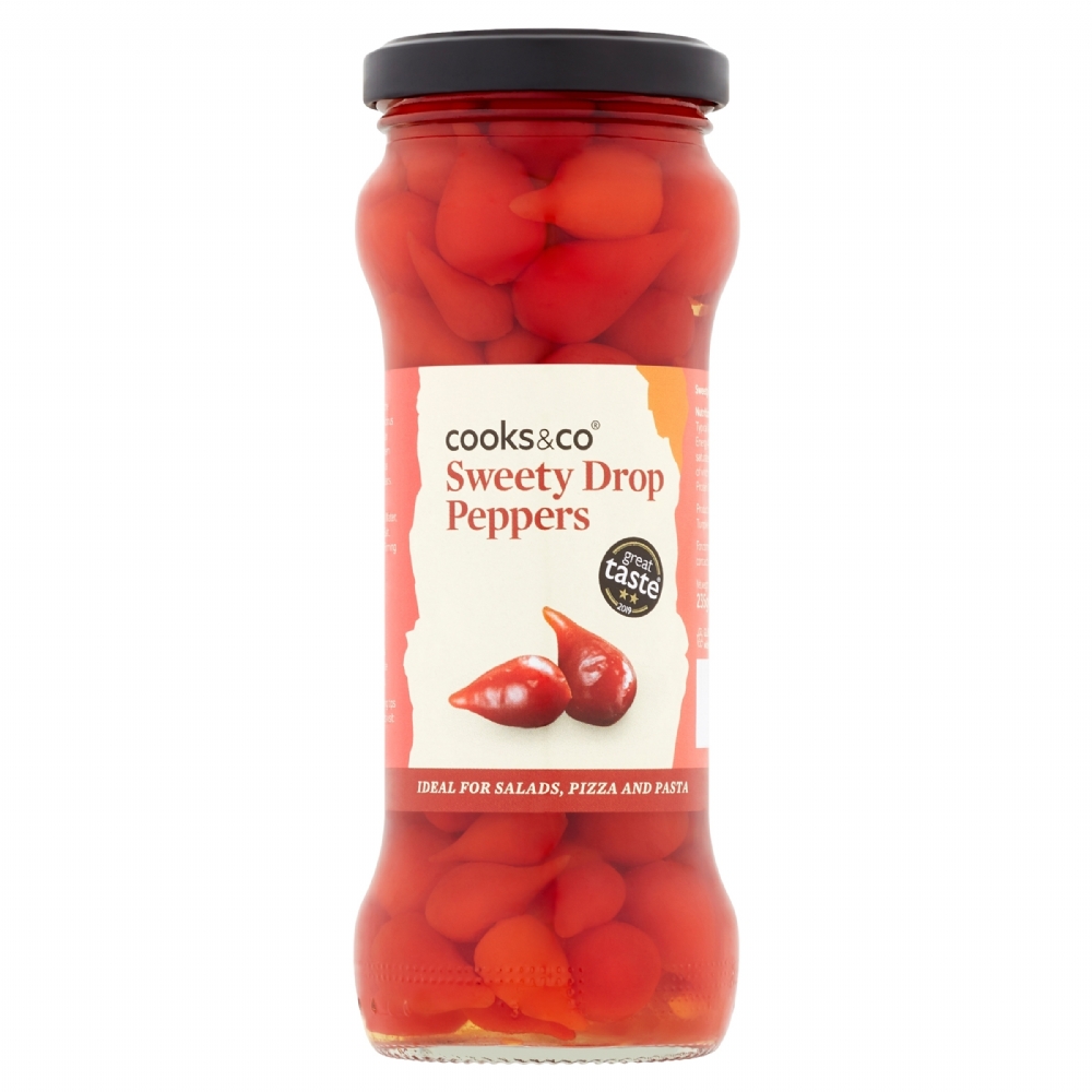 Sweety Drop Peppers (64%), Water, Sugar, Sugar Cane Vinegar, Salt, Antioxidant: Ascorbic Acid, Firming Agent: Calcium Chloride.