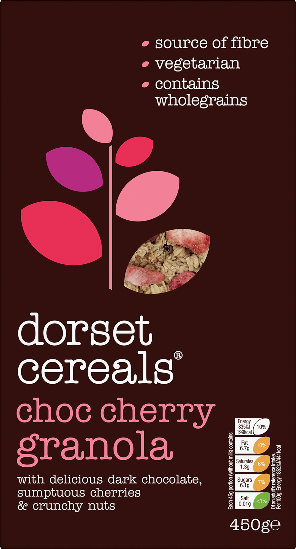 Our choc cherry granola is an indulgent mix of dark chocolate, cherries and nuts, gently baked with jumbo oats and golden syrup