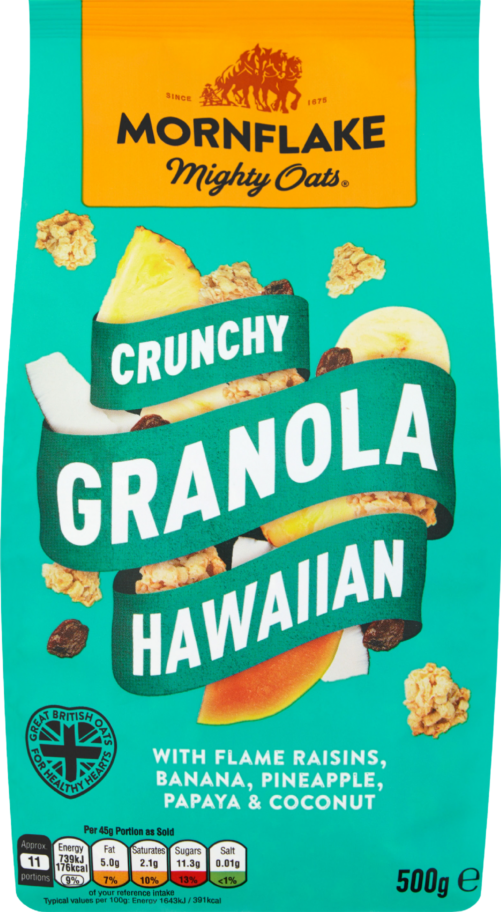 Mornflake Hawaiian Oat Granola is packed full of flavour! The finest oats are milled and toasted in Mornflake's unique way – they then combine them with juicy raisins, tropical banana and pineapple pieces to create the tastiest, crunchiest granola clusters. They contain wholegrain too, providing high fibre. With such a delicious start to your day, it’s hard to resist refilling your bowl.