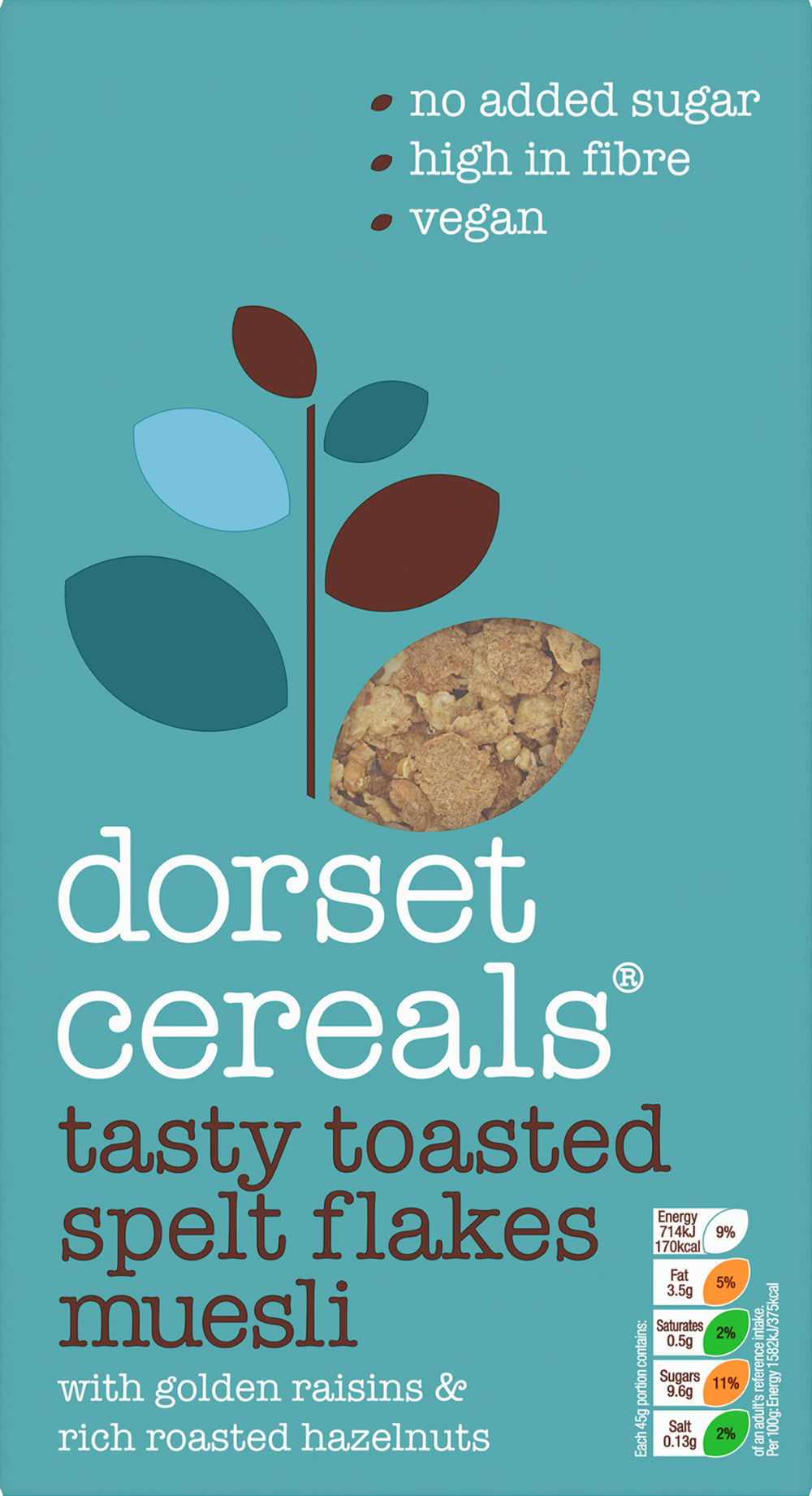Dried Fruit (32%) [Sultanas, Chopped Dates, Golden Raisins (2%) (Golden Raisins, Preservative (Sulphur Dioxide)), Raisins], Toasted Barley Flakes (Barley, Salt) Spelt (Wheat) Flakes (19%) (Spelt (Wheat), Salt, Emulsifier (Sunflower Lecithin)) Wholegrain Oat Flakes Nuts (7%) [Roasted Whole Hazelnuts (4%), Sliced Almonds] Pumpkin Seeds (4%).