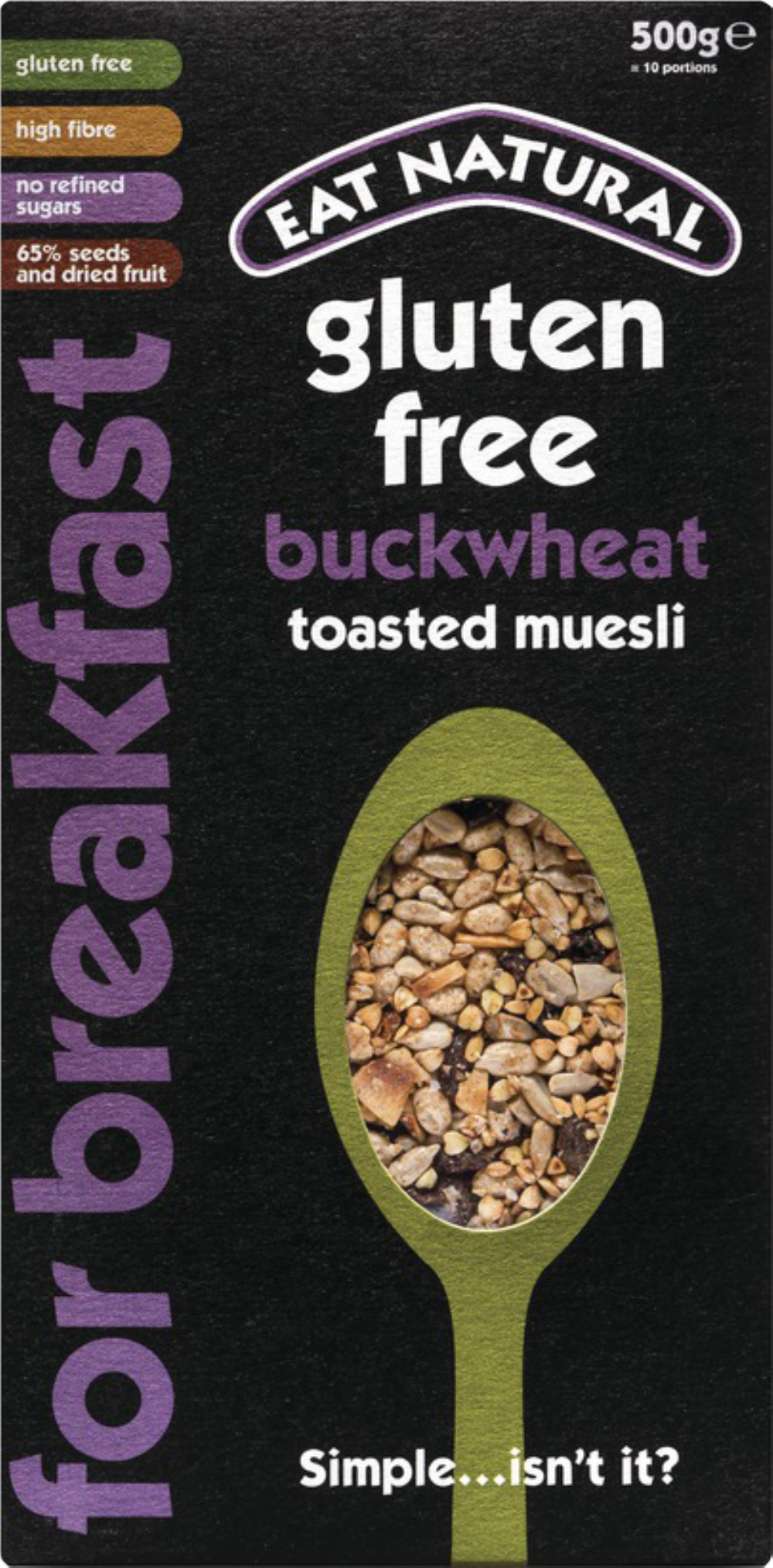 Eat Natural's light but filling buckwheat muesli ticks every box: toasted buckwheat; succulent and sweet vine fruits; a crunchy three-seed mix; and crisp puffs of toasted rice. A drizzle of honey and a hint of warming cinnamon add sweetness. The muesli gets a quick toasting to bring out the buttery flavours. Gluten doesn’t get a look in. Crisp and sweet.