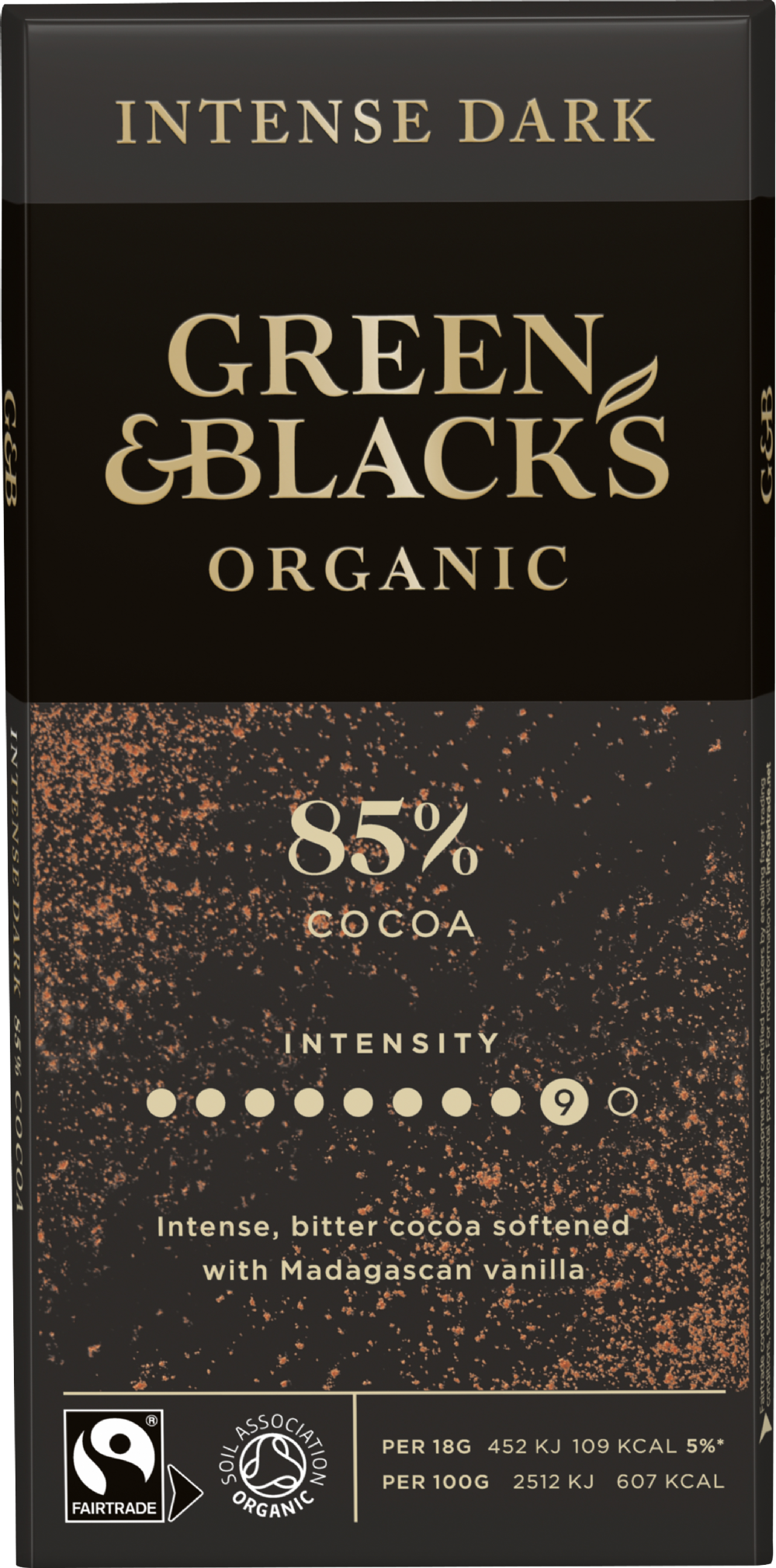 Make your tastebuds work for it. Green & Black's use 85% cocoa solids for an intense hit of cocoa. It's balanced with just enough sugar to separate the bitterness and the acidity, resulting in an almost savoury note. The organic vanilla naturally seasons the chocolate and softens its bitterness.