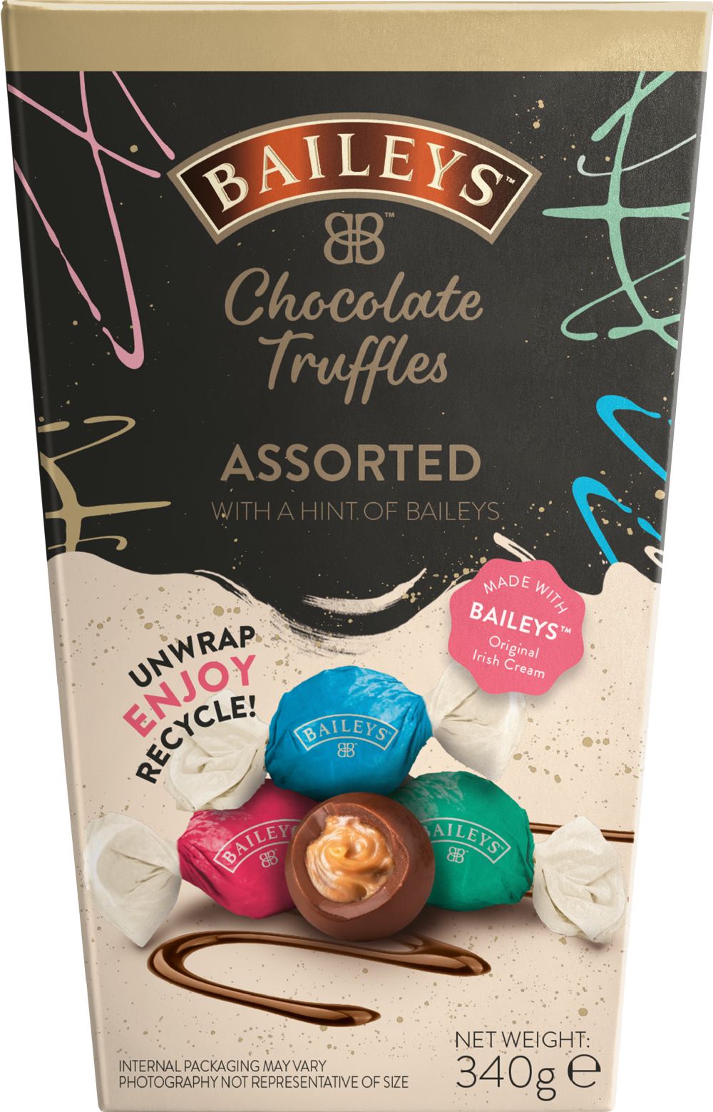 Milk and white chocolate truffles with Baileys™ original, salted caramel, strawberry, and mint flavour centres.