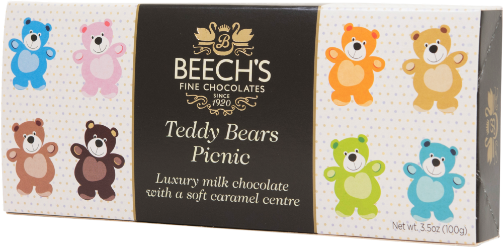 Cute and cuddly chocolate Teddy Family. Each member of the Teddy Family has a deliciously creamy caramel centre covered in velvety milk chocolate.