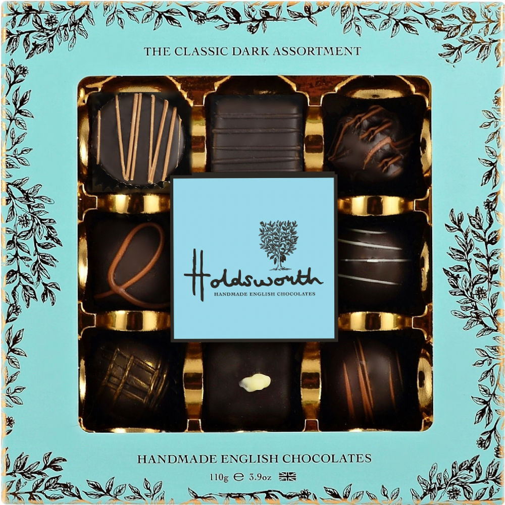 A collection of decadent ganache truffles, creamy caramels & moreish pralines, smothered in delicious dark chocolate. Hand packed into a stunning blue, foil embossed window box.