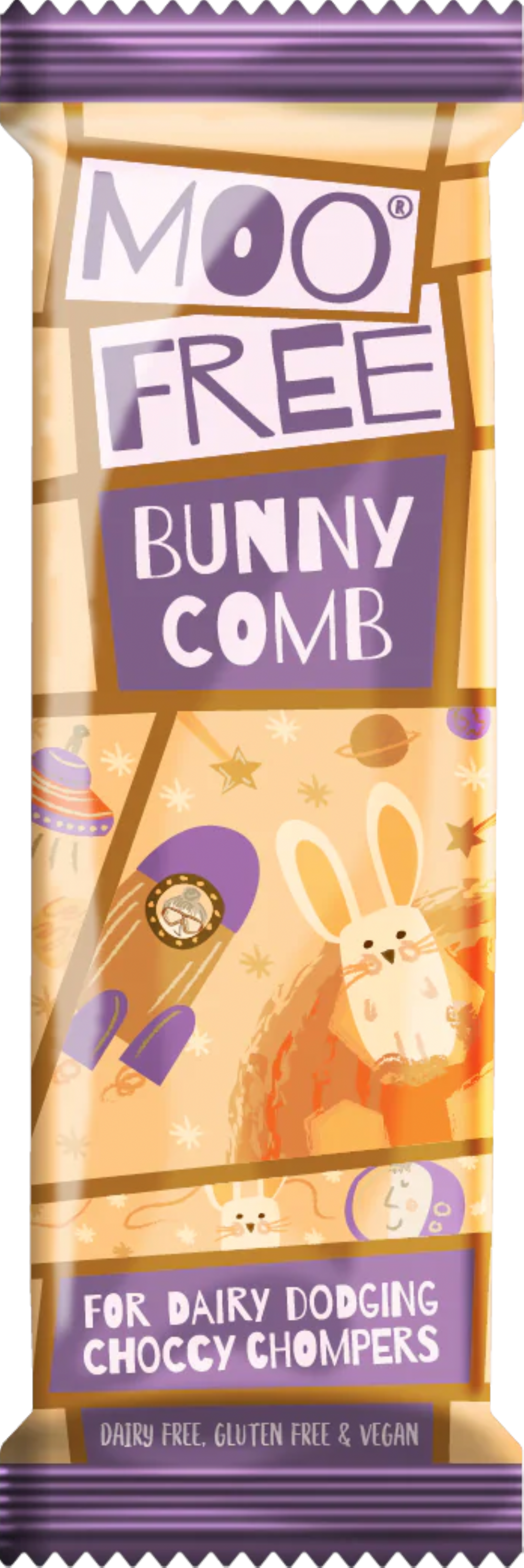 A bite-size bar of Moo Free's scrummy dairy free chocolate with crunchy pieces of vegan friendly honeycomb toffee. Perfect for dairy dodging choccy chompers!