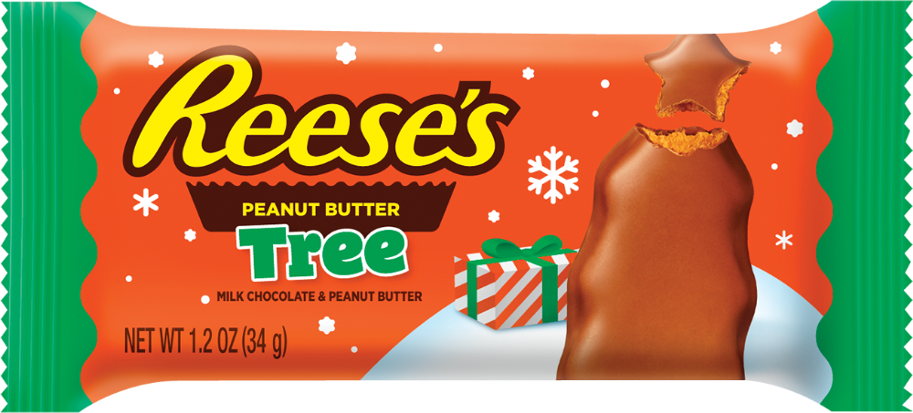 A peanut butter filling surrounded in chocolate in the shape of a Christmas Tree.