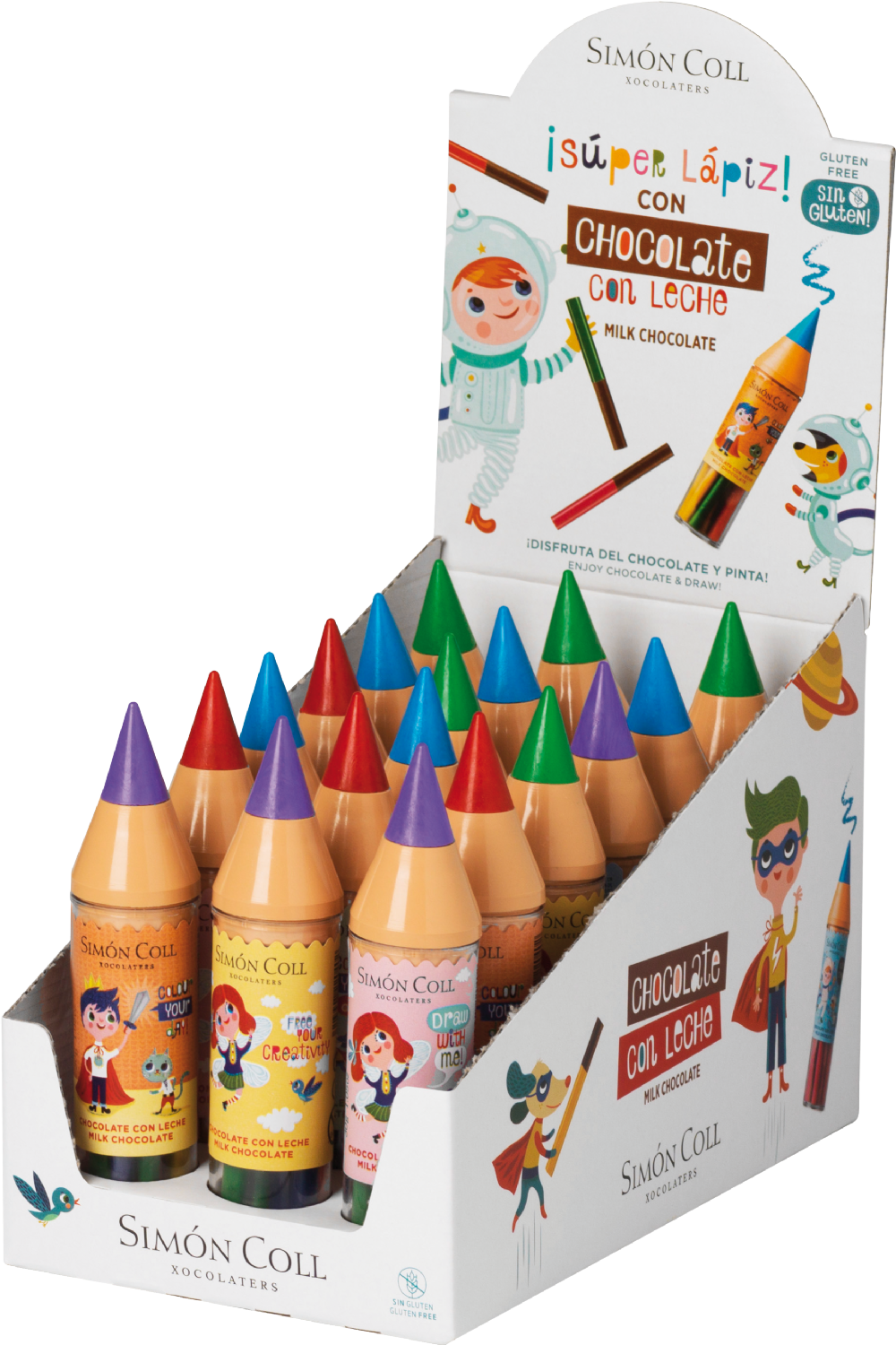 With this pen box filled with noble milk chocolate sticks by the Spanish noble chocolate producer Simon Coll you also can draw! With the coloured nib of the pen box childrens are able to draw and besides they can nibble the ingredient one by one... or all at one time!