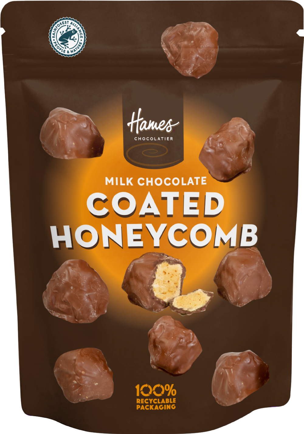 Delight in the irresistible crunch of Hames Munch Pouches filled with milk chocolate coated honeycomb. A deliciously crunchy chocolate treat in every bite! Golden, airy honeycomb pieces are generously coated in smooth, creamy milk chocolate for the perfect balance of sweet and crunchy.