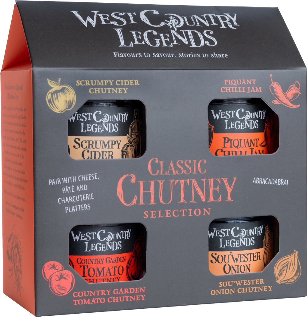 This selection tells the story of the West Country, one spoonful at a time. From the smoky sweetness of Sou'wester Onion to the sun-ripened richness of Country Garden Tomato Chutney, the fiery kick of Piquant Chilli Jam, and the bold, boozy warmth of our Scrumpy Chutney – every jar is a chapter steeped in local flavour. A feast of legends in one box, ready to pair with your favourite cheeses and awaken the spirit of this storied land.