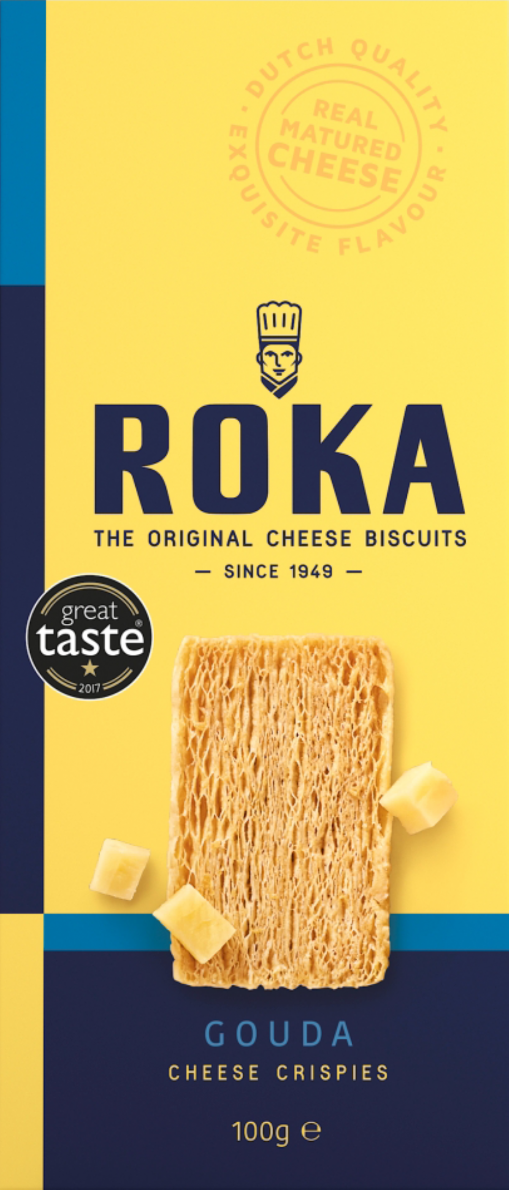 Roka Cheese sticks are still baked following the original recipe which was created in 1949 in the Roodenrijs patisserie shop in Delft. Gouda Cheese Crispies are made with refined puff-pastry (90 layers), 30% carefully matured old Gouda cheese and other high-quality ingredients, offering an intense and dominant cheese taste that melts on the tongue.