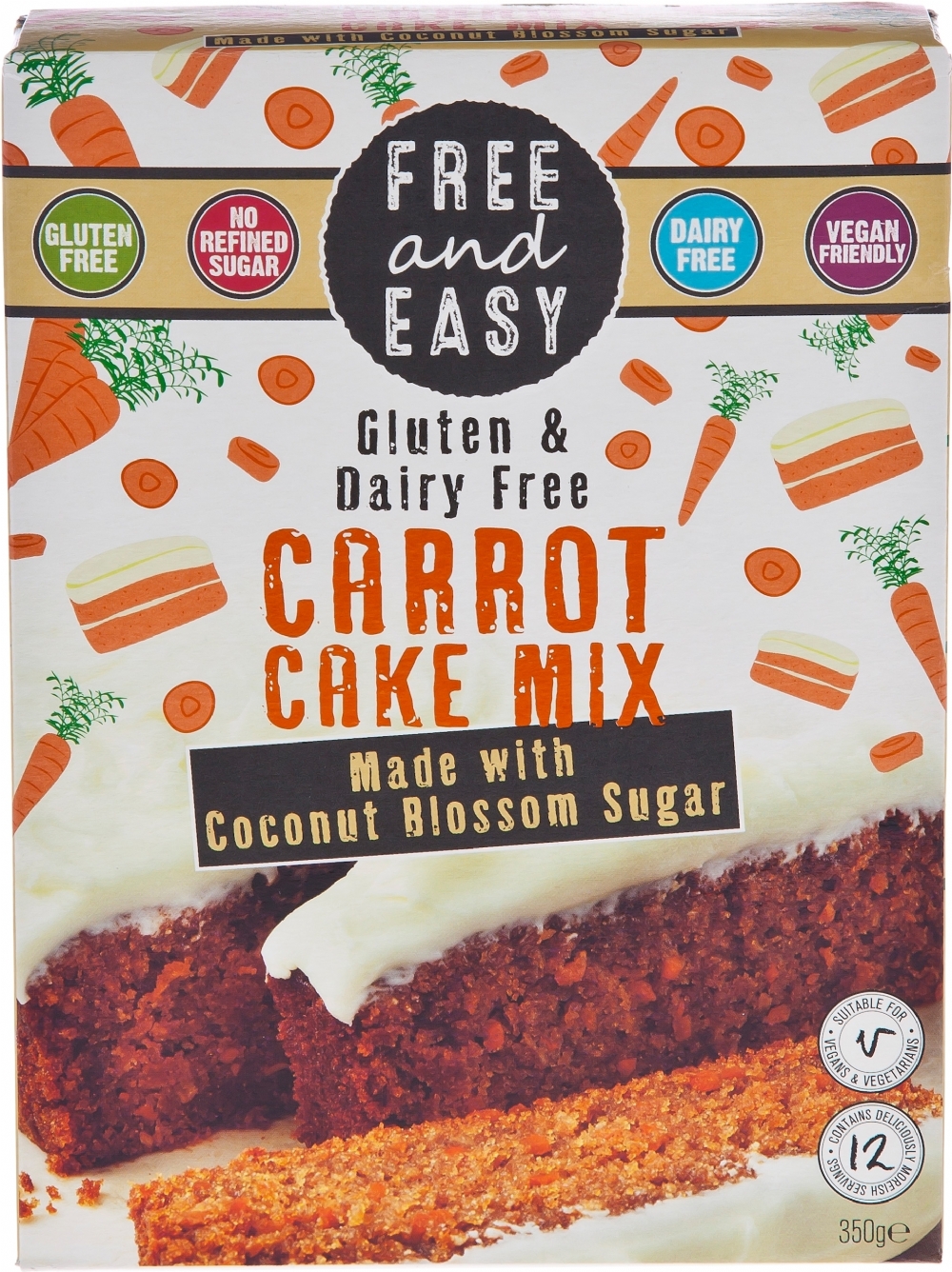 Coconut Palm Sugar (47%), Gluten Free Plain Flour ( Rice, Potato, Tapioca, Maize, Buckwheat), Carrot (6%), Desiccated Coconut, Raising Agents (Mono Calcium Phosphate, Corn Starch, Sodium Bicarbonate), Potato Starch, Tapioca Starch, Ground Cinnamon, Bicarbonate of Soda, Acidity Regulator (Citric Acid).