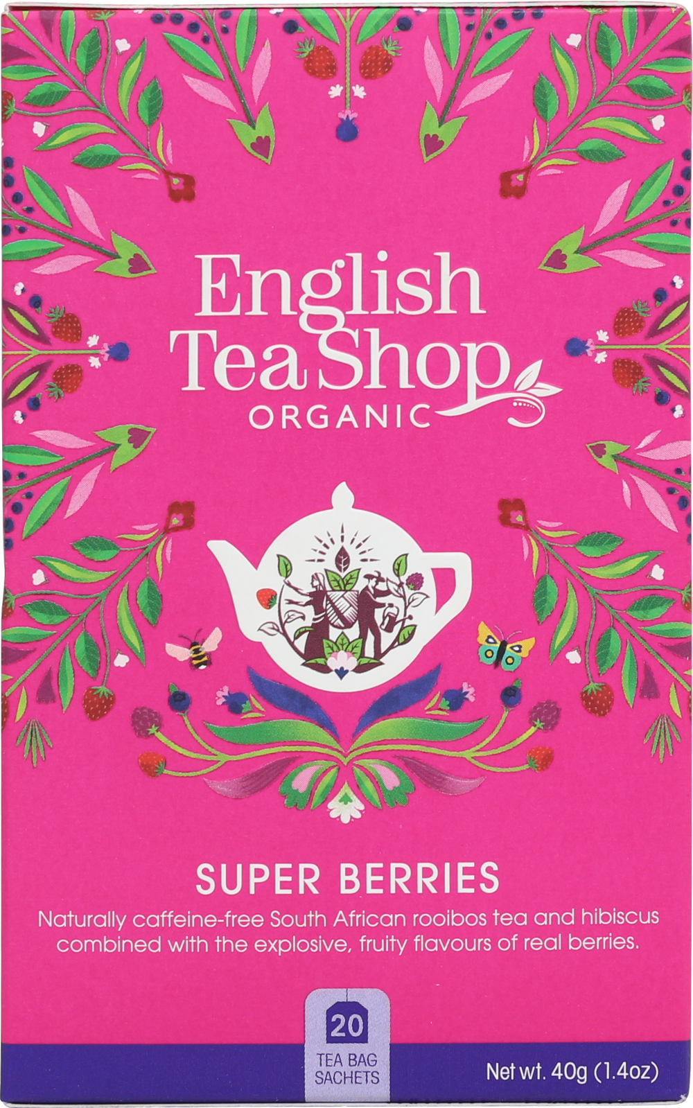 Organic Hibiscus (63%), Organic Rooibos (19%), Natural Flavourings (5%), Organic Spearmint (4%), Organic Raspberries (3%), Organic Strawberries (3%), Organic Blueberries (3%).