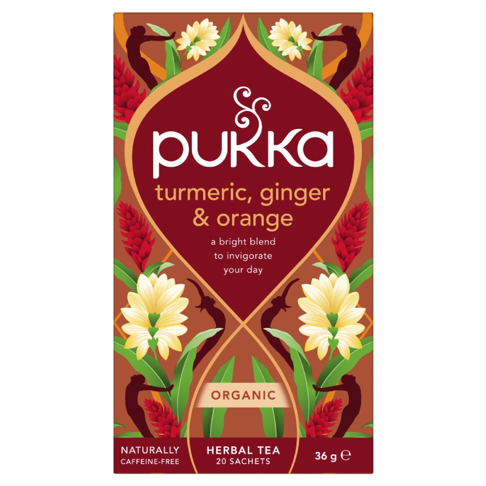 Turmeric Root (31.5%), Ginger Root (26.5%), Galangal Root (14%), Licorice Root, Nettle Leaf, Burdock Root, Orange Essential Oil Flavour.