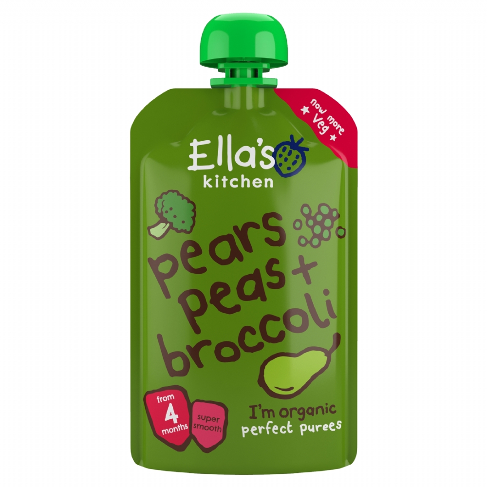 Organic pears 79%, organic peas 14%, organic broccoli 7%, organic lemon juice concentrate (a dash), other stuff 0%.