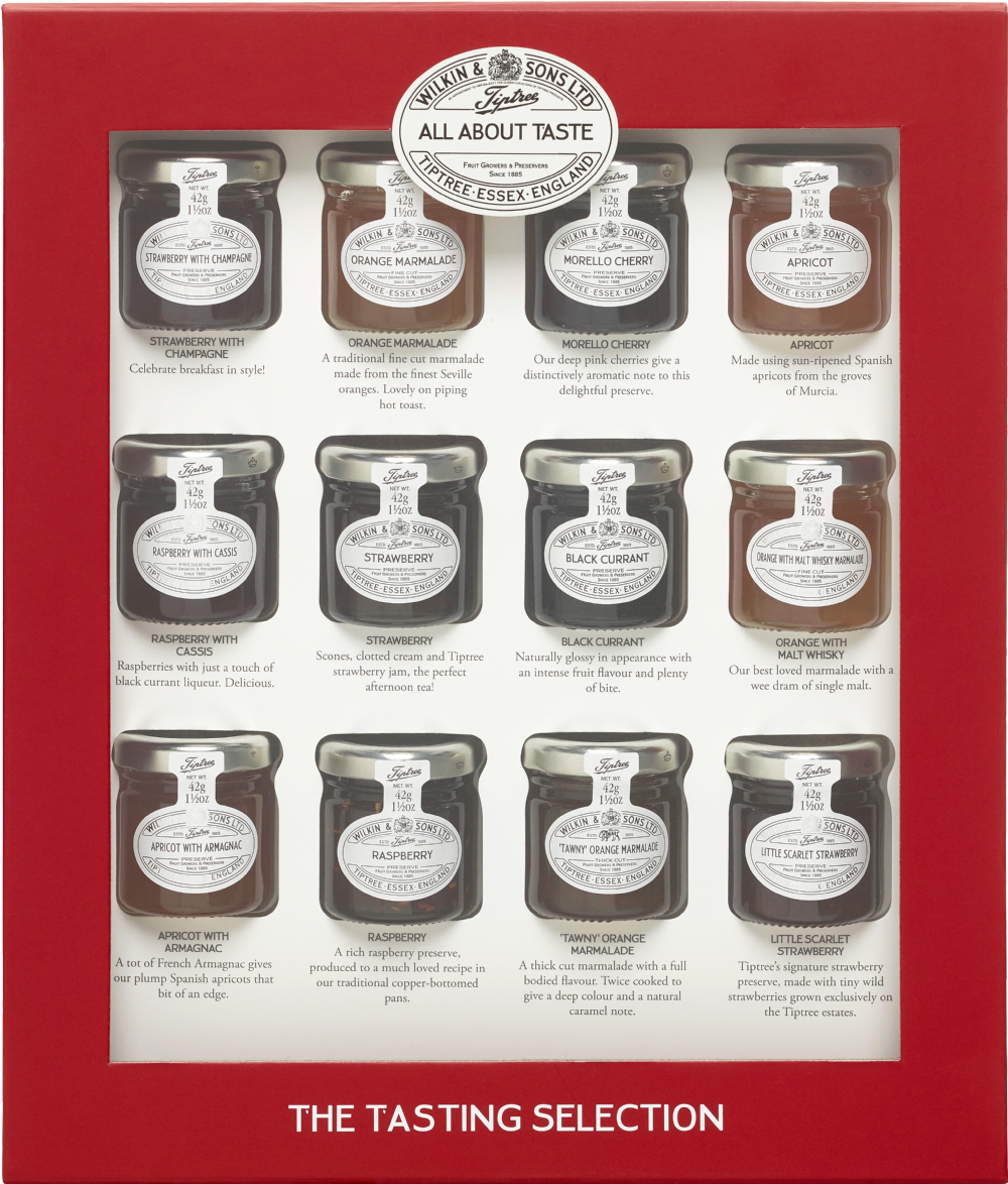 The Tasting Selection is presented in a smart red case and consists of 12 x 42g pots - Strawberry with Champagne Preserve, Tiptree Orange Marmalade, Morello Cherry Preserve, Apricot Preserve, Raspberry with Cassis Preserve, Tiptree Strawberry Preserve, Blackcurrant Preserve, Orange Marmalade with Malt Whisky, Apricot with Armagnac Preserve, Raspberry Preserve, Tawny Orange Marmalade, Little Scarlet Strawberry Preserve.