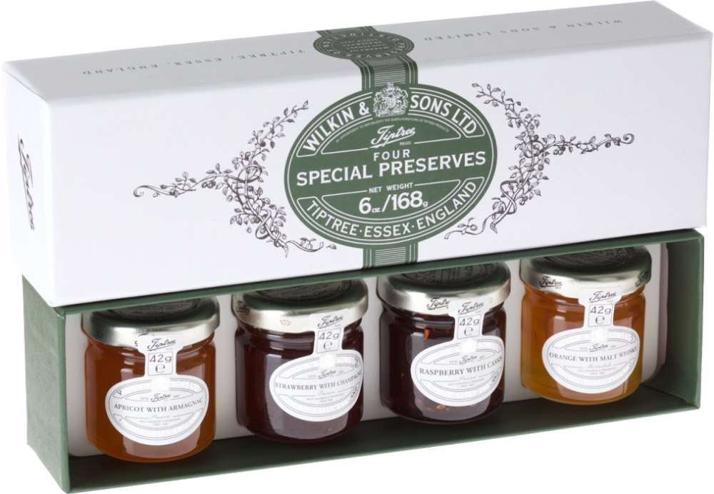 A popular gift pack containing 4 x 42g Speciality conserves - Apricot & Armagnac Preserve, Strawberry & Champagne Preserve, Raspberry & Cassis Preserve, Orange & Malt Whisky Marmalade.