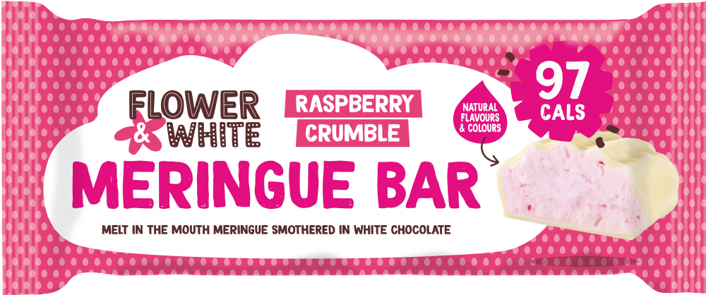 Raspberry Crumble Meringue Bar covered in white chocolate with a melting meringue middle. At 95 Calories per bar, it's a punnet of pleasure you can pick up any time! Natural Flavours and Colours. No additives. No nasties.