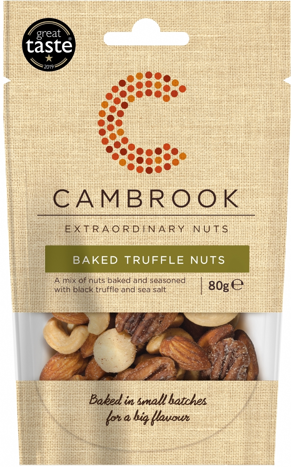 Almonds, cashews, macadamias, pecans, baked and seasoned with a distinctive aromatic black truffle and sea salt