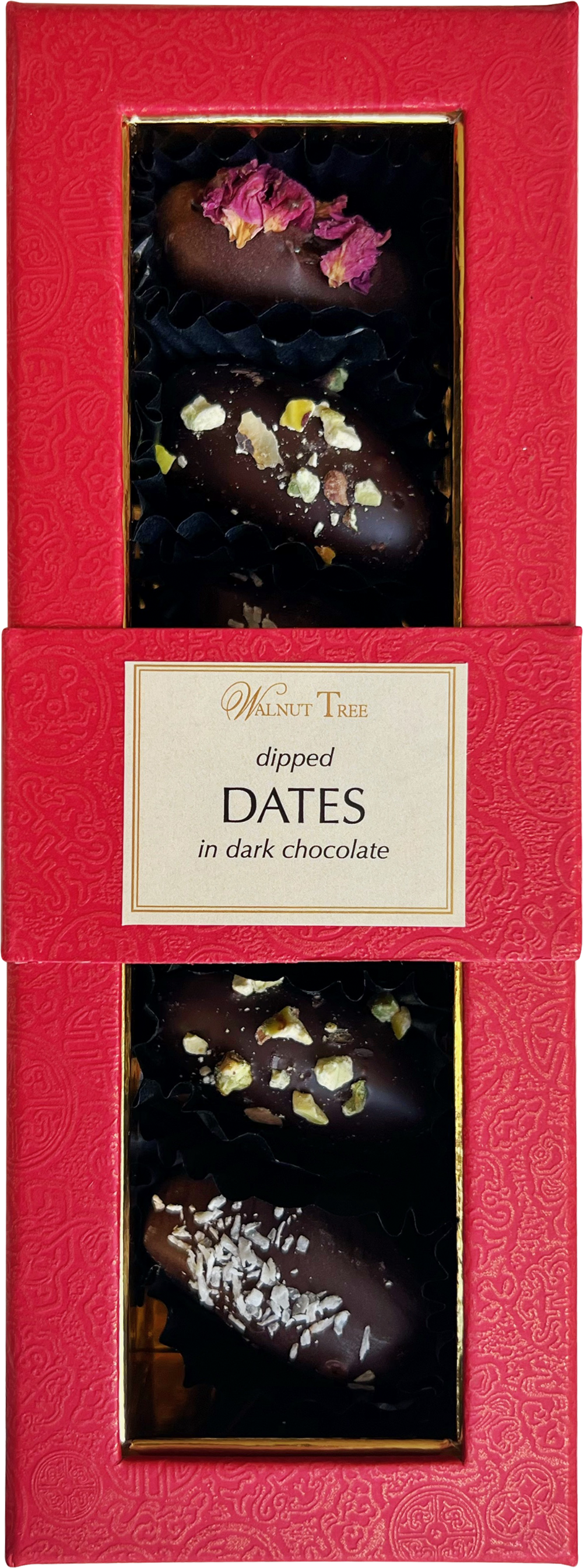 Our dates are a celebration of contrast and craftsmanship. Each honeyed deglet noir date — soft, sun-ripened and naturally sweet — is completely enrobed in smooth, 55% dark chocolate, then hand-finished with a delicate topping: crushed pistachios for savoury crunch, fragrant rose petals for floral elegance, diced coconut for creamy sweetness. Bite through the glossy chocolate shell to reveal the luscious fruit within — an indulgence that feels both nourishing and deeply satisfying.
