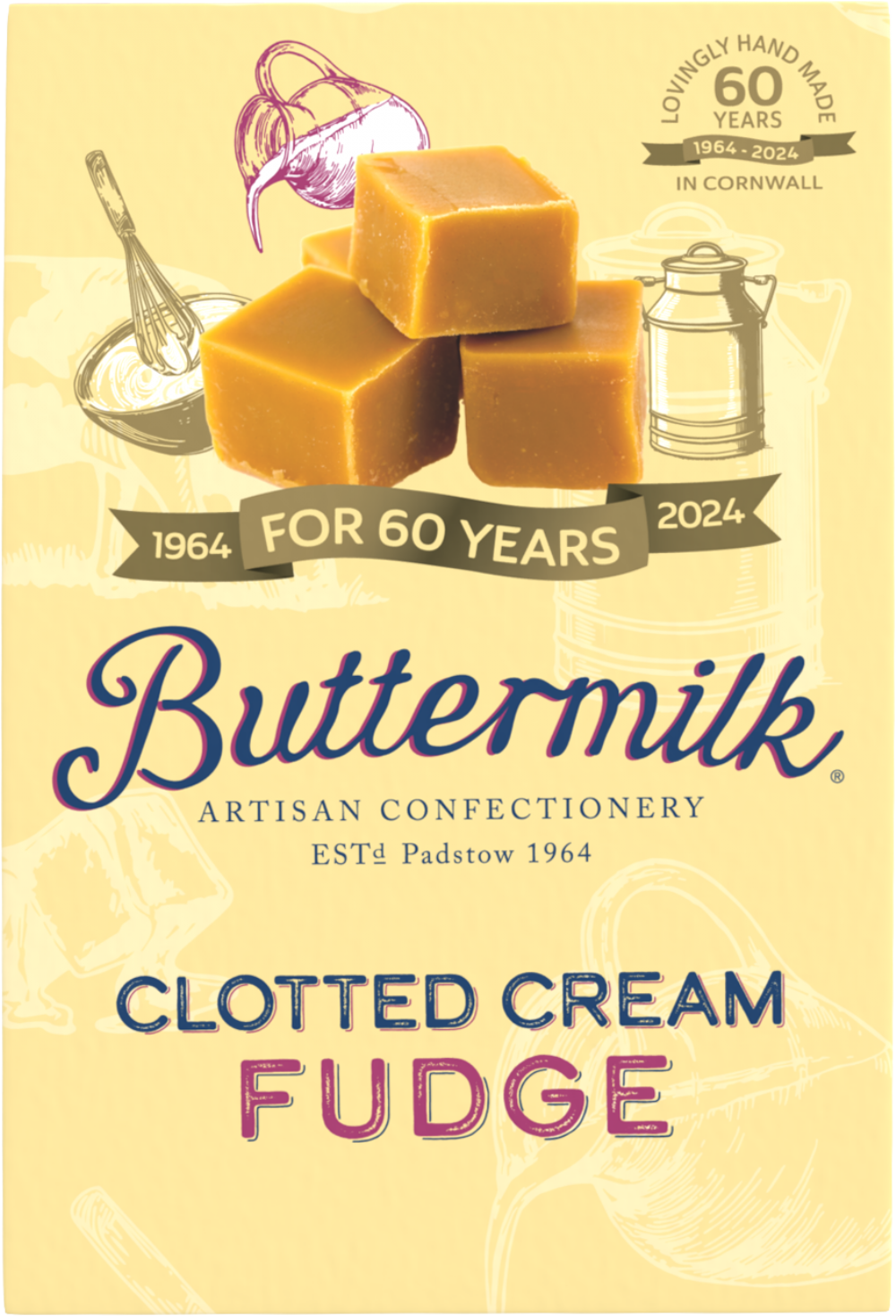 Buttermilk's signature clotted cream fudge in a special 60 year anniversary pack. Lovingly hand made in Cornwall since 1964.