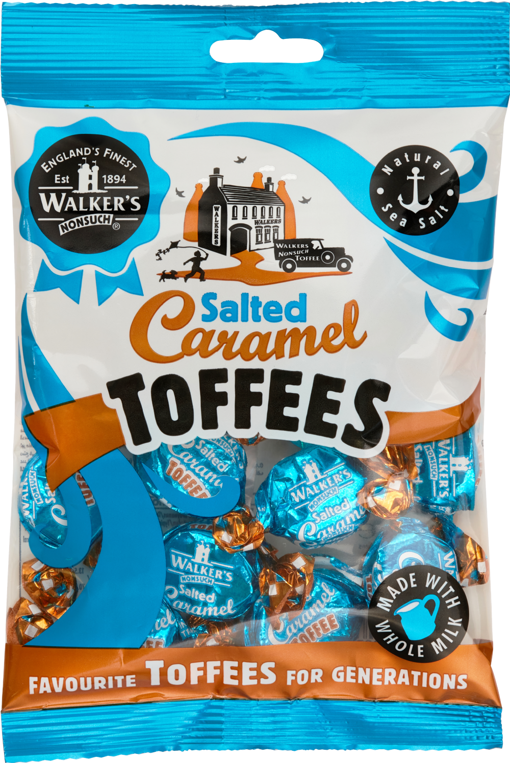 Our twist wrapped Salted Caramel Toffees in a 150g bag. They are made with Anglesey Sea Salt.