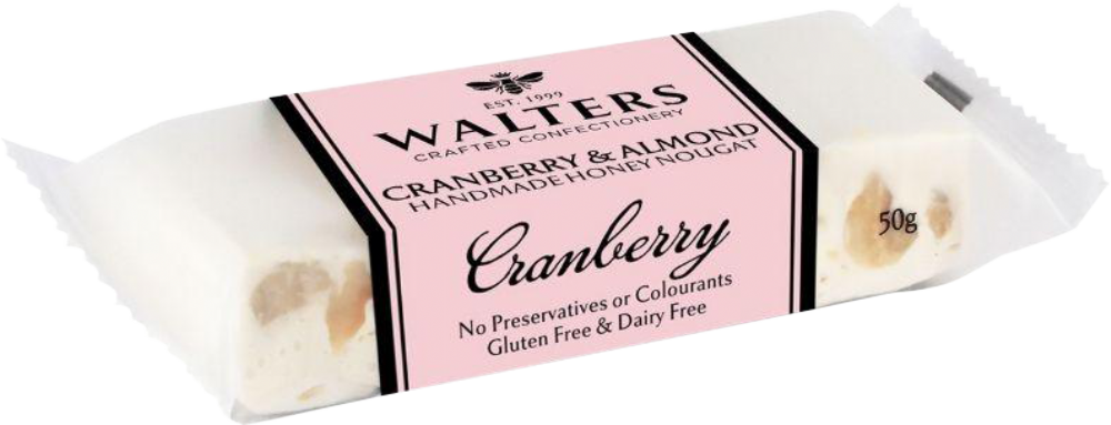 Glucose Syrup, Sugar, Almonds (26%), Honey (10%), Egg Albumen Powder, Cranberry (cranberries, sugar, vegetable oil (sunflower seed)) (8%), Wafer Paper (potato starch, water, vegetable oil (olive fruit)), Vanilla Flavouring, Salt.